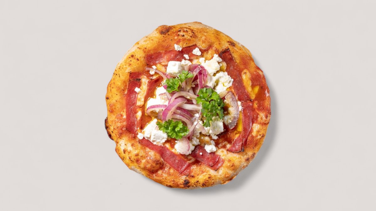 mit Tomatensoße, Käse, Putensalami, Schafskäse, Petersilie und Zwiebeln