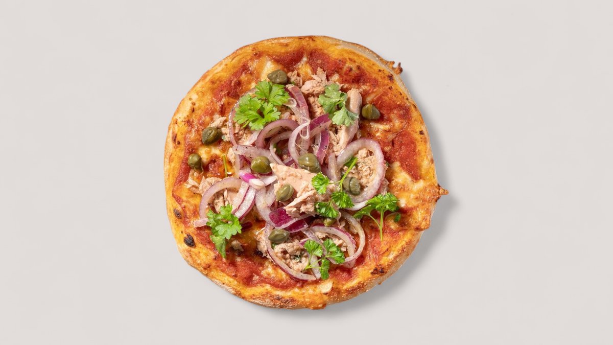 mit Tomatensoße, Käse, Thunfisch, Kapern und Zwiebeln