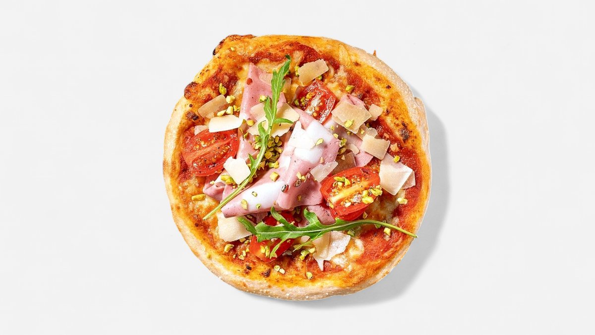 mit Tomatensoße, Käse, Mortadella, Pistazien, frischen Tomaten und Parmesan