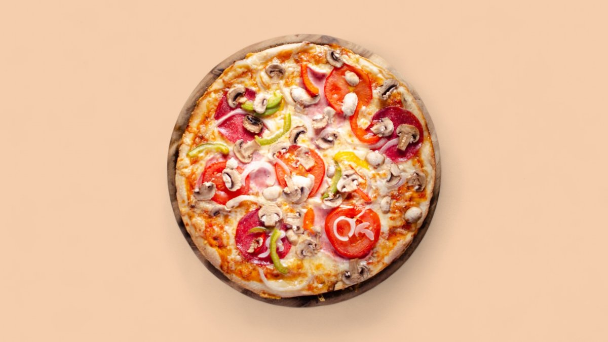 mit würziger Salami, gekochtem Schinken, frischen Tomaten, weißen Zwiebeln, knackiger Paprika und frischen Champignons