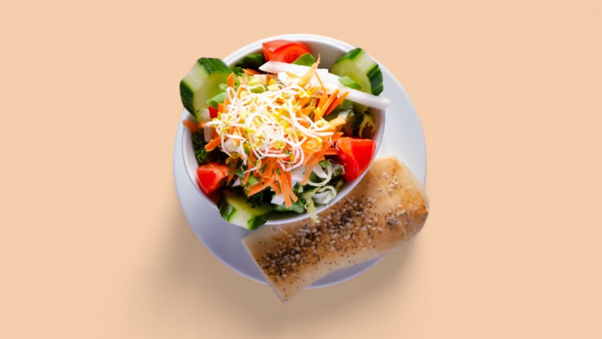 Unser Salat wird mit frisch gebackenem Brot und einem hausgemachten Dressing deiner Wahl serviert
