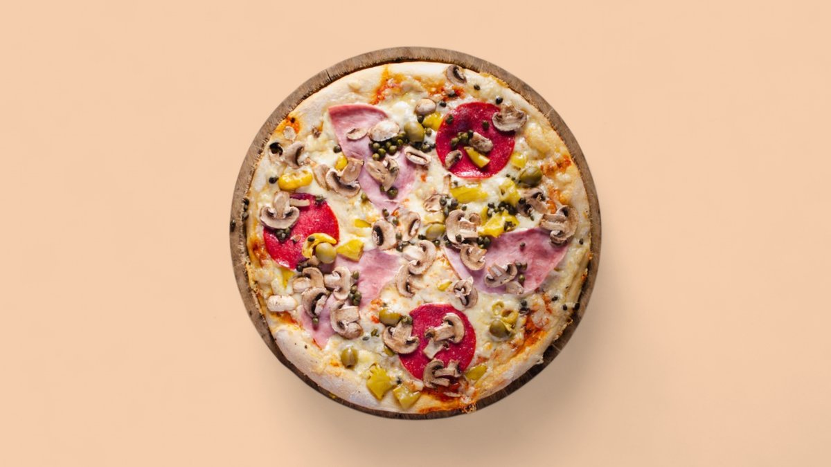 mit würziger Salami, gekochtem Schinken, frischen Champignons, grünen Oliven, milder Peperoni und aromatischen Kapern