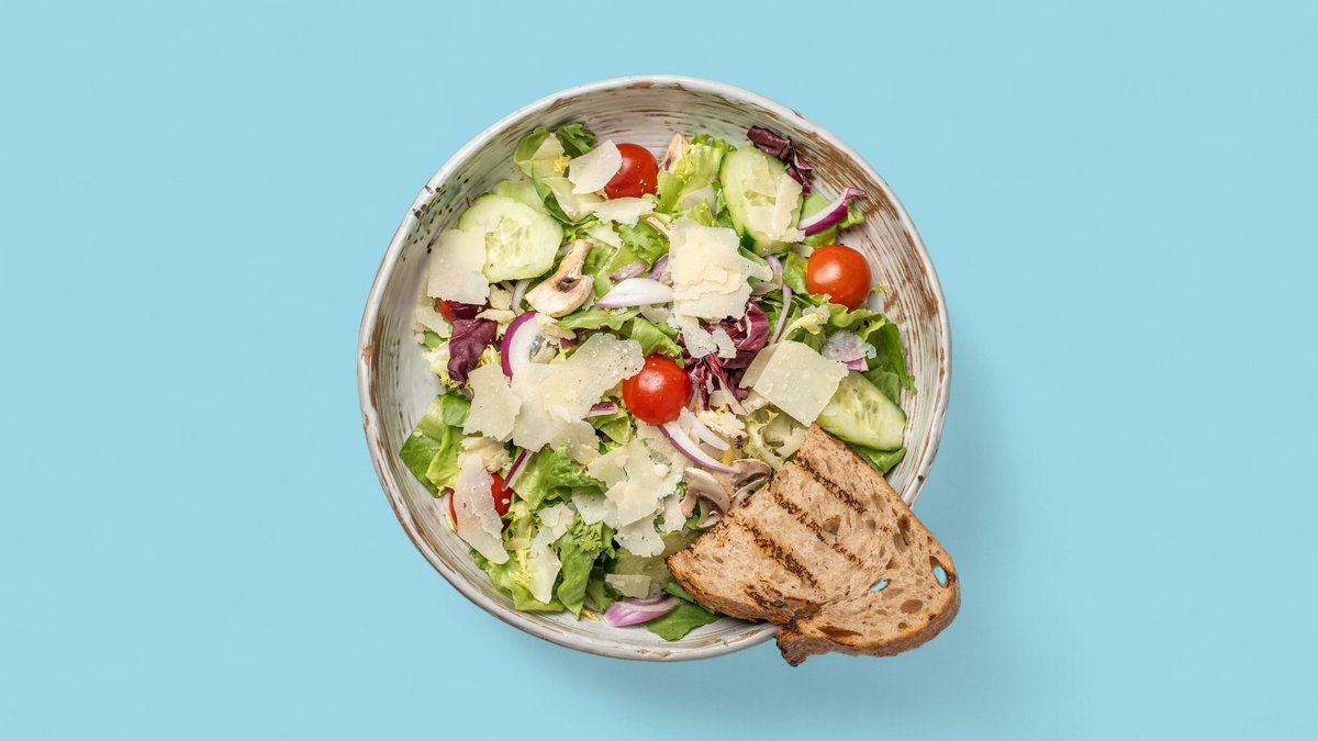 with mixed salad, onions, peppers, cherry tomatoes, radishes, cucumbers, mushrooms, zucchini and Italian hard cheese