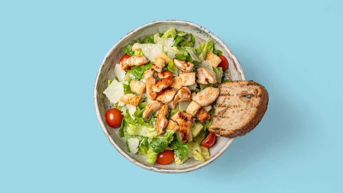 with romaine lettuce, chicken, cherry tomatoes, garlic croutons and Italian hard cheese