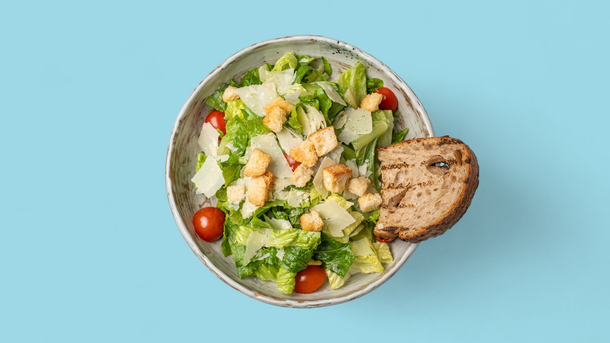 with romaine lettuce, cherry tomatoes, garlic croutons and Italian hard cheese