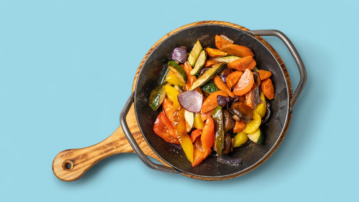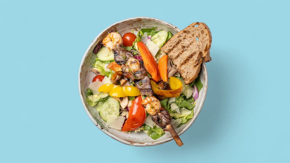 large mixed salad with surf and turf beef skewer, chimichurri glaze and grilled vegetables