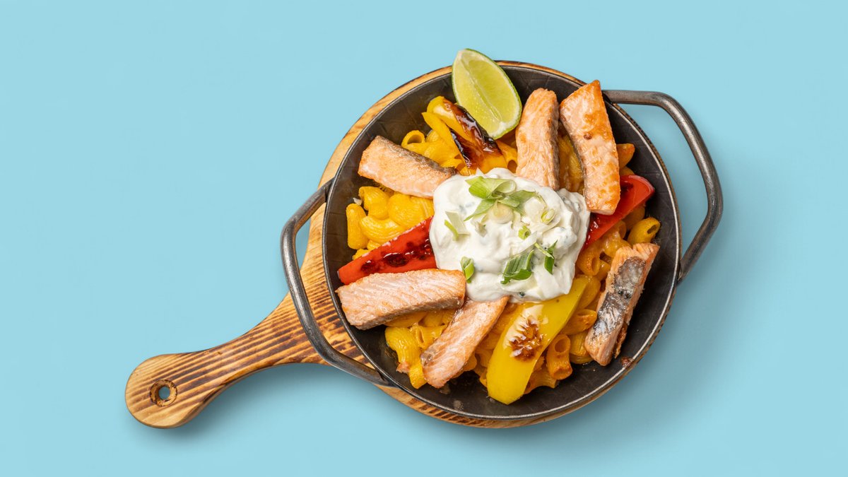 200g salmon fillet, mashed potatoes, cucumber salad, lime and dill