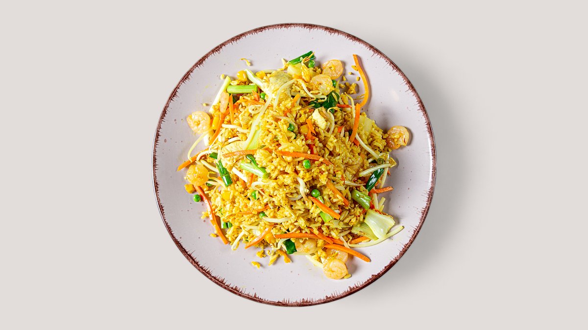 gebratener Reis mit Hähnchenfleisch und Krabben