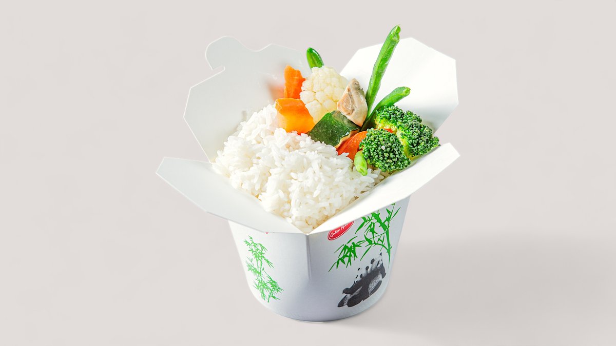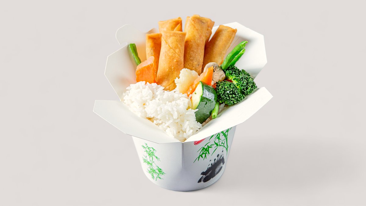 Jasminreis mit Wokgemüse und 6 Stück vegetarischer Frühlingsrollen