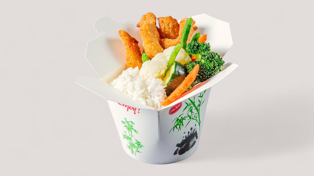 Jasminreis mit Wokgemüse und paniertem Hähnchen