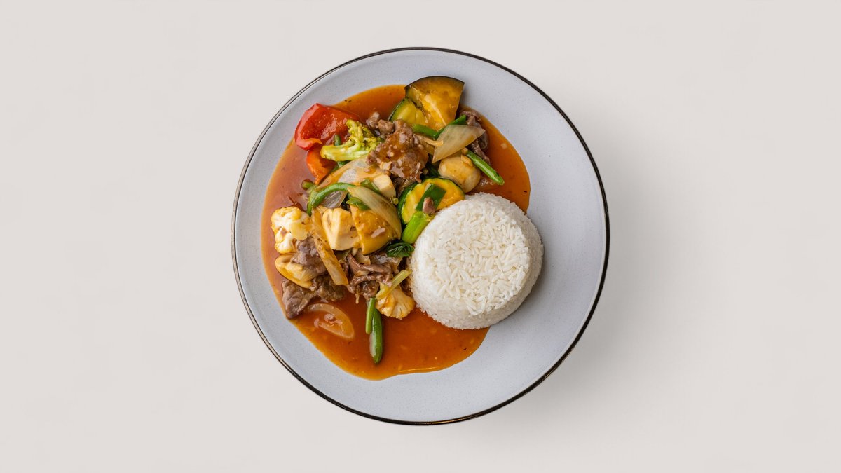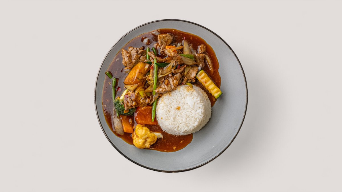 alle Gerichte werden mit verschiedenem Wok-Gemüse und Jasminreis zubereitet („Rindfleisch mit Zwiebeln” wird ohne Wok-Gemüse zubereitet)