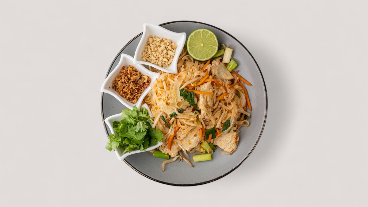 thailändisches Bratnudelgericht mit Hühnerfleisch, Erdnüssen und Röstzwiebeln