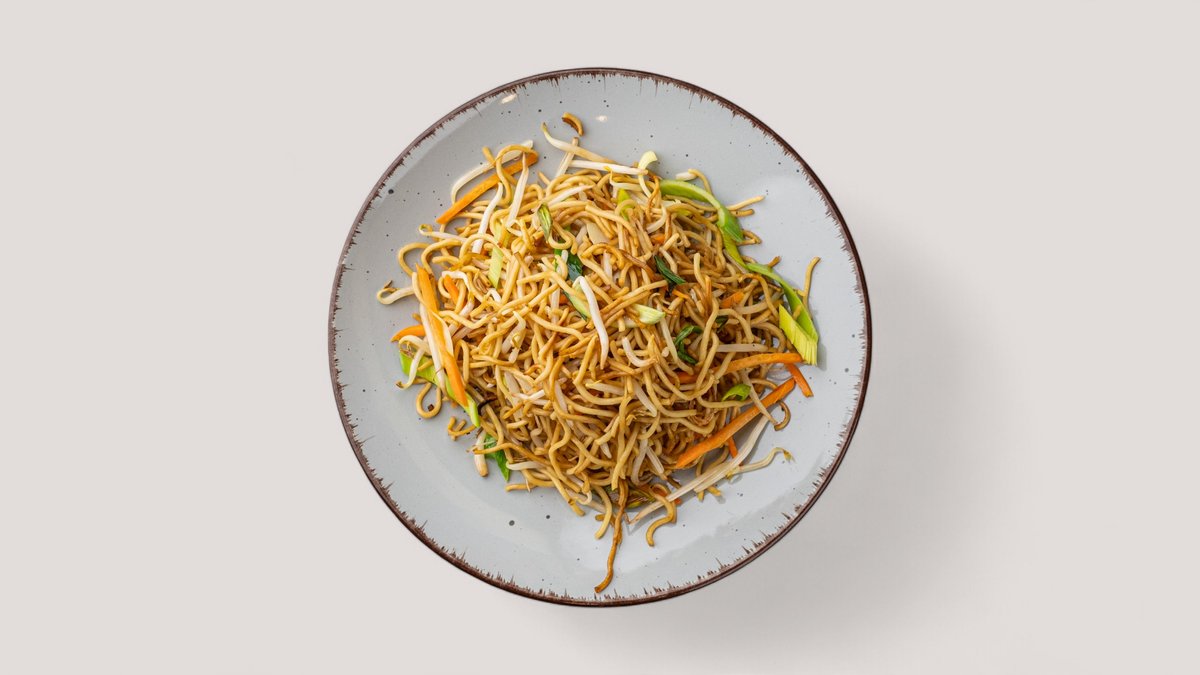 gebratene Nudeln und 6 vegetarische Frühlingsrollen