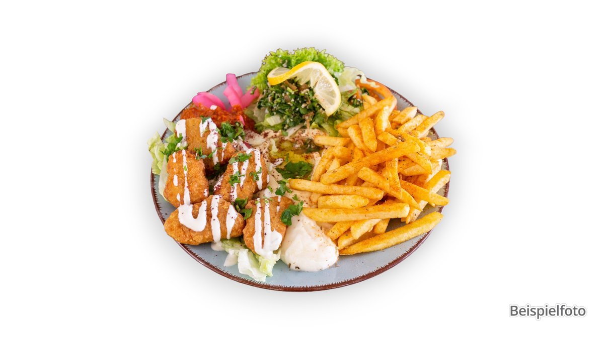 alle Gerichte werden mit einer Fleischsorte deiner Wahl und einer Soße deiner Wahl serviert („Drehspieẞ-Mix” wird ohne Fleischsorte deiner Wahl zubereitet)