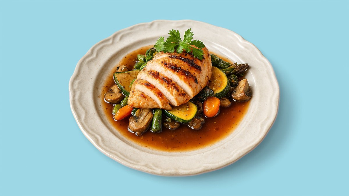Hühnchen, Sous-vide-gegart und gegrillt, auf knackigem Bratgemüse, serviert mit einer Mango-Currysoße