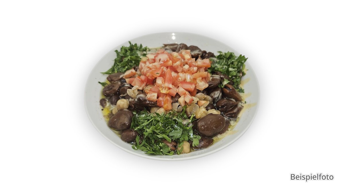 chickpeas with sesame sauce, yogurt, olive oil, olives, tomatoes, pickles, chili peppers, fresh mint and flatbread