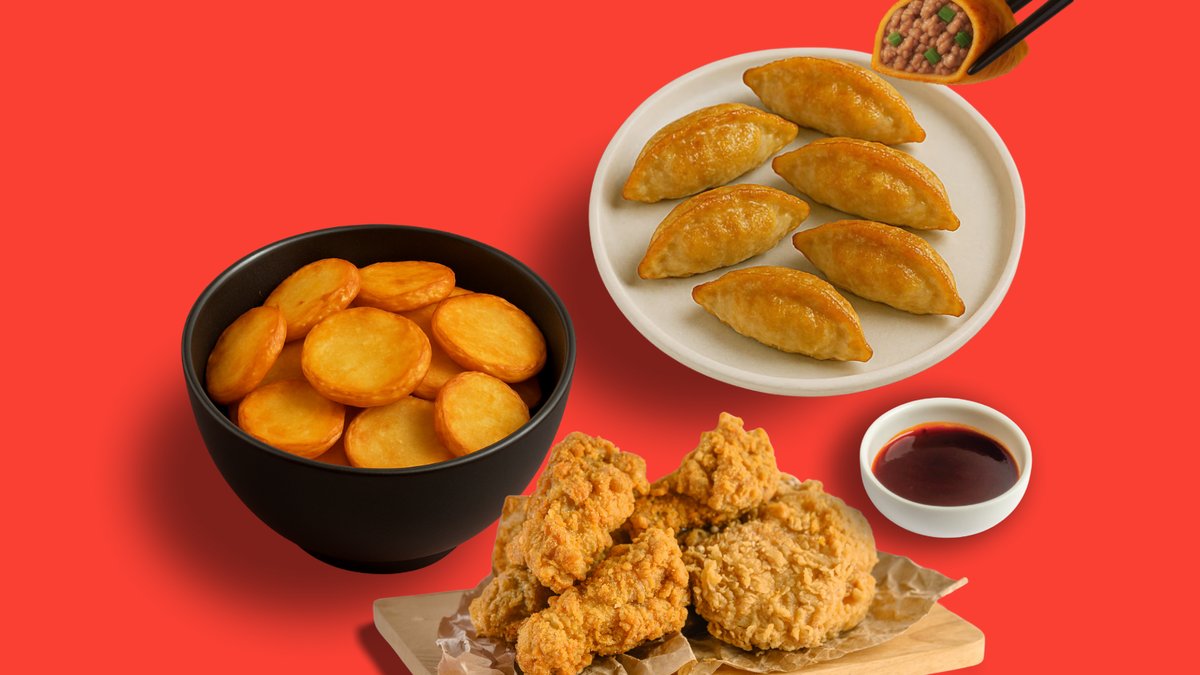 6x fried beef BBQ or chicken dumplings, 1x portion of Korean fried chicken (small), 1x portion of fried potatoes, 1x sauce