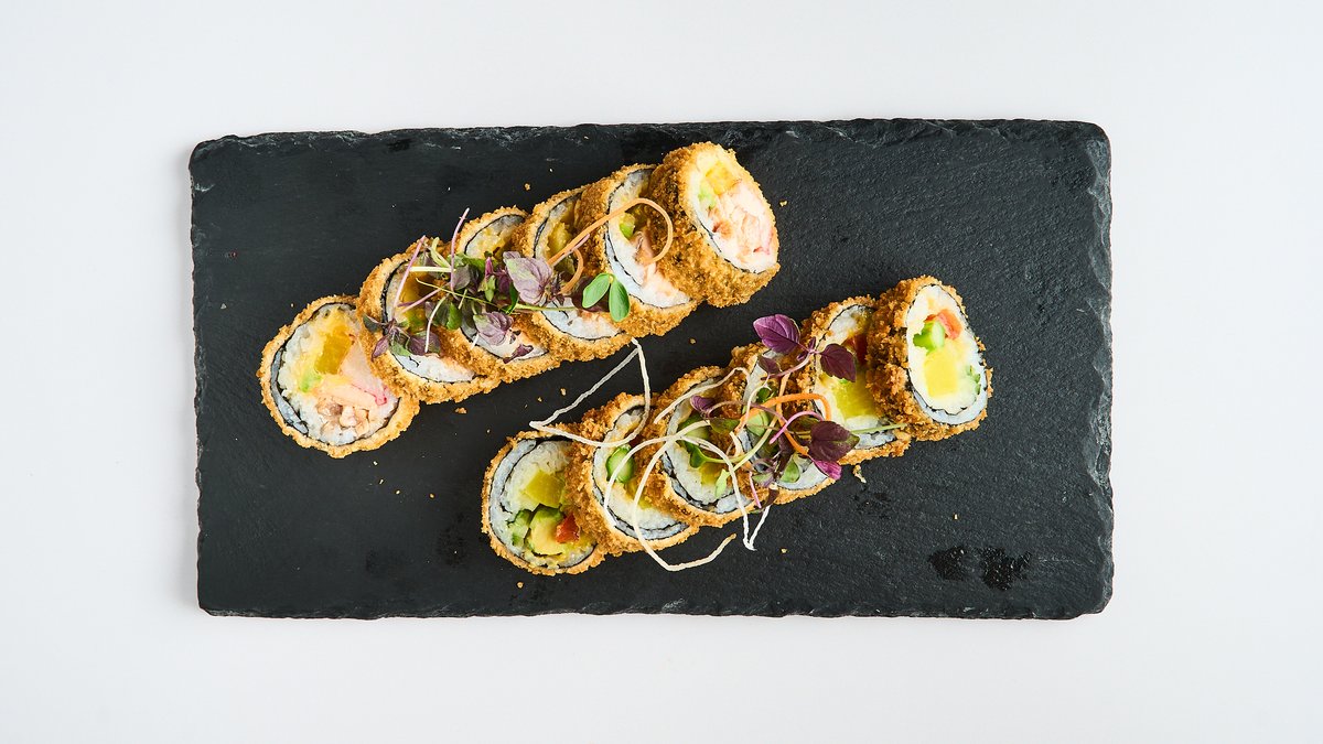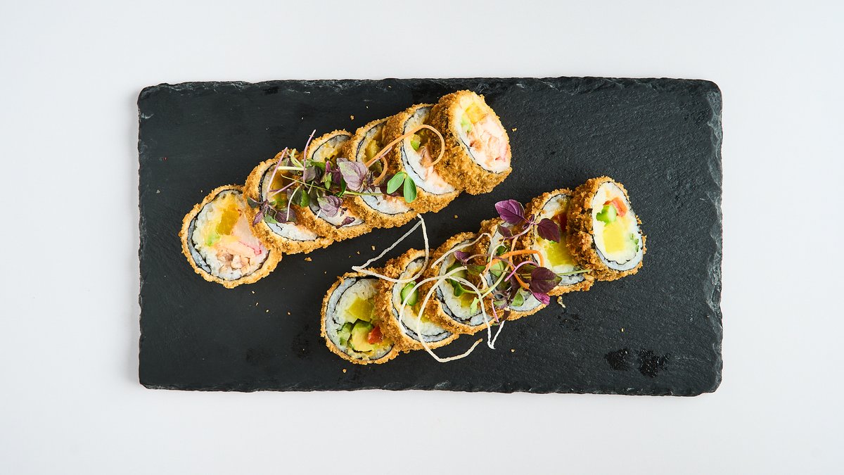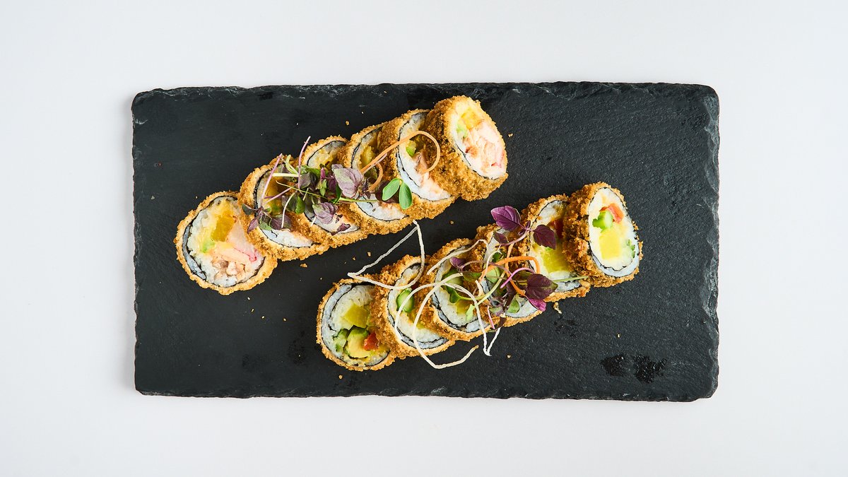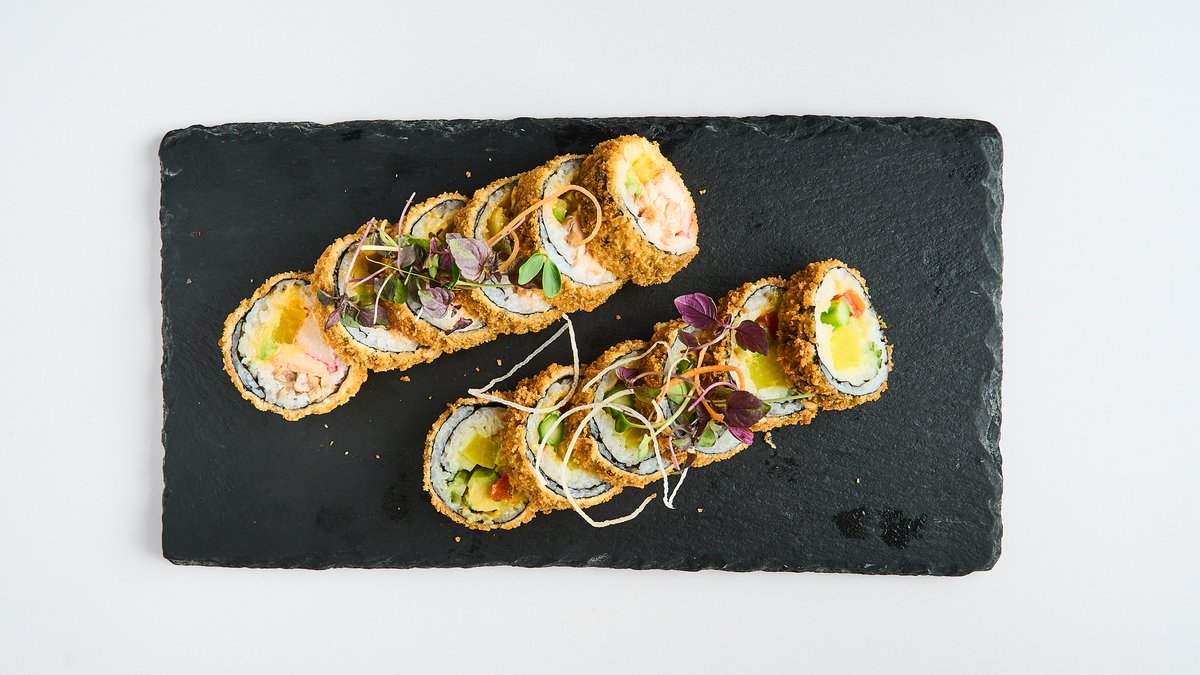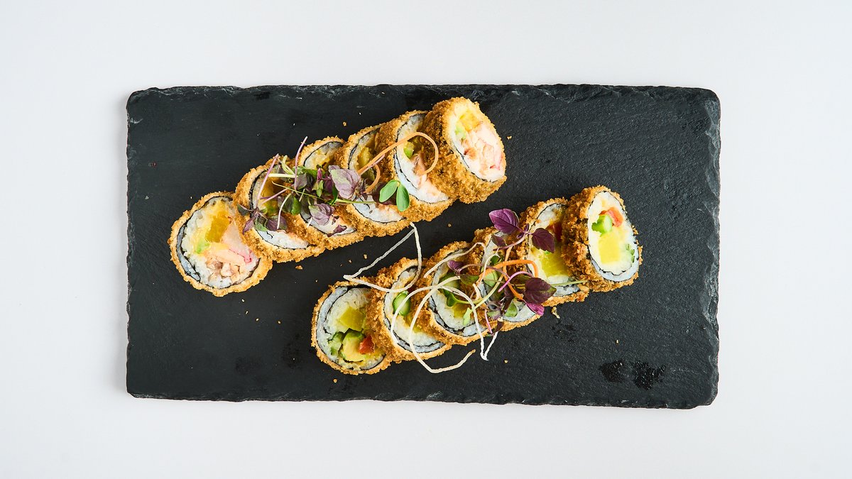 deep-fried maki with tobiko, wrapped with salmon, tuna and crayfish tartare