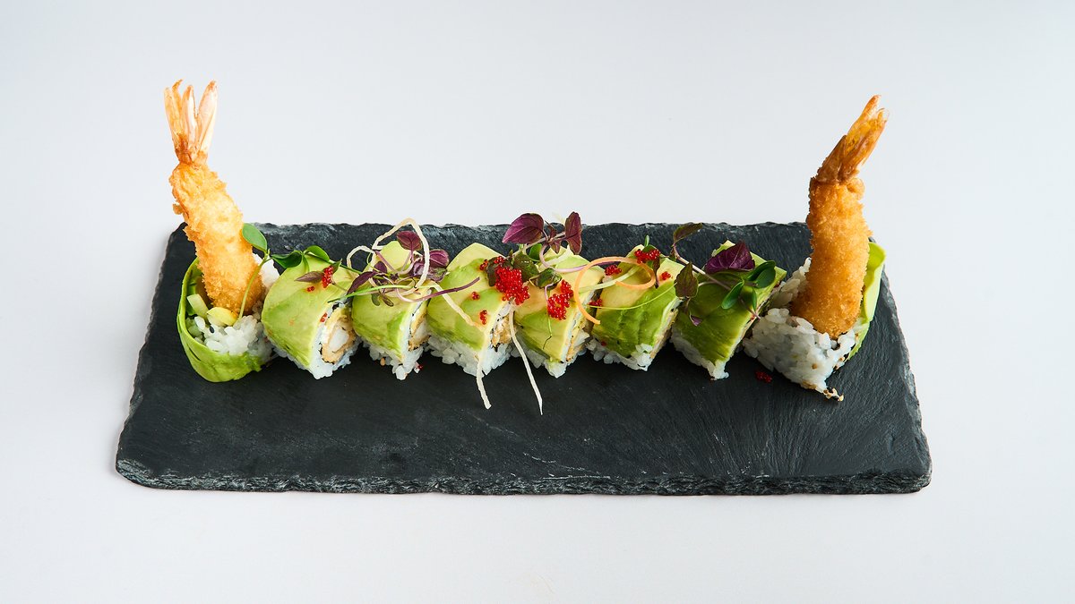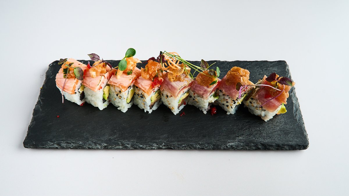 with crispy avocado tempura, wrapped with flambéed salmon, tuna and butterfish