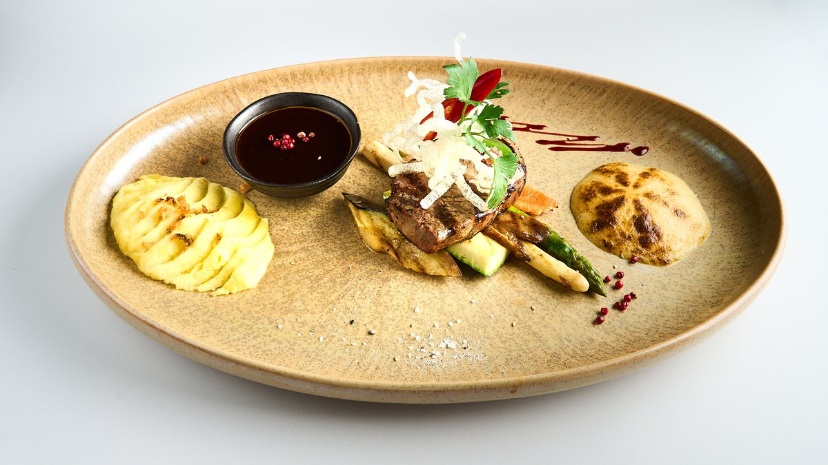 with beef fillet, asparagus and mango