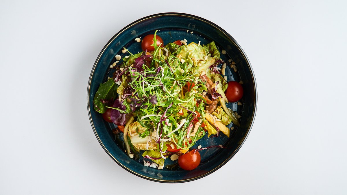 with wild herb salad, seaweed, marinated crispy chicken leg and homemade dressing
