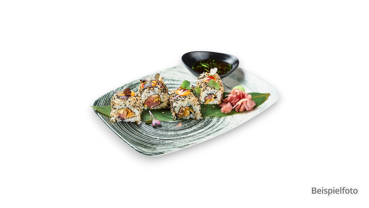 with tuna tempura, tobiko and sesame, wrapped with avocado and chili mayonnaise sauce
