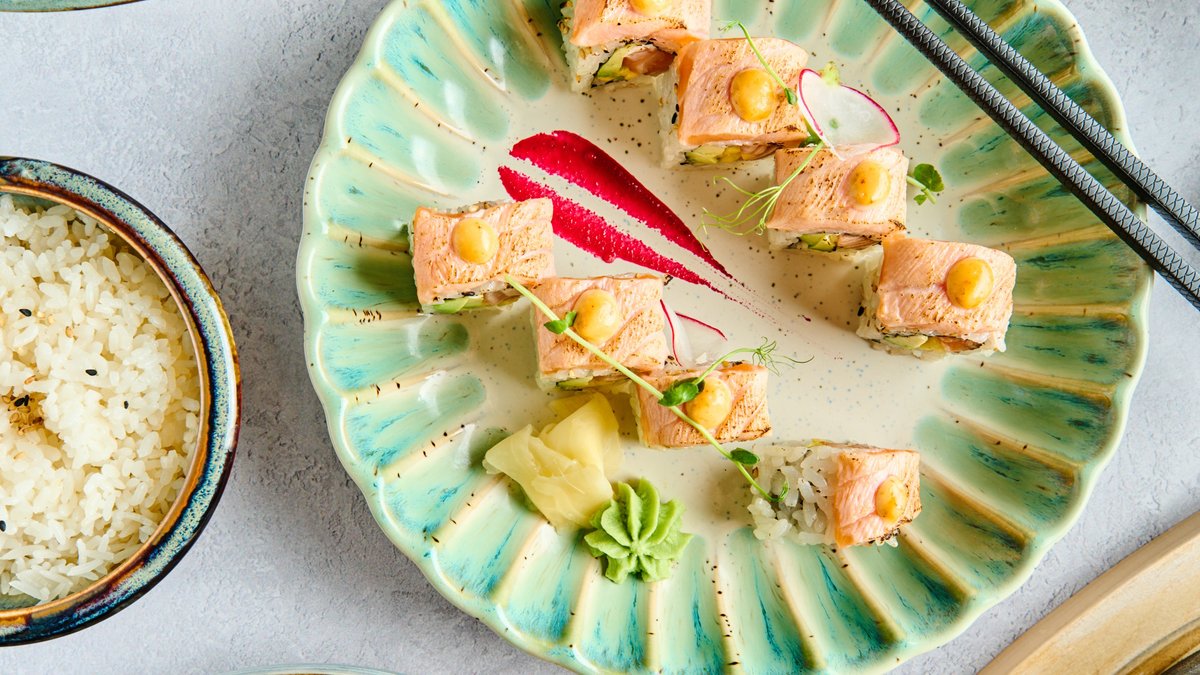 Lachs, Avocado, Mango, Philly Cheese und Sesam umwickelt mit flambiertem Lachs
