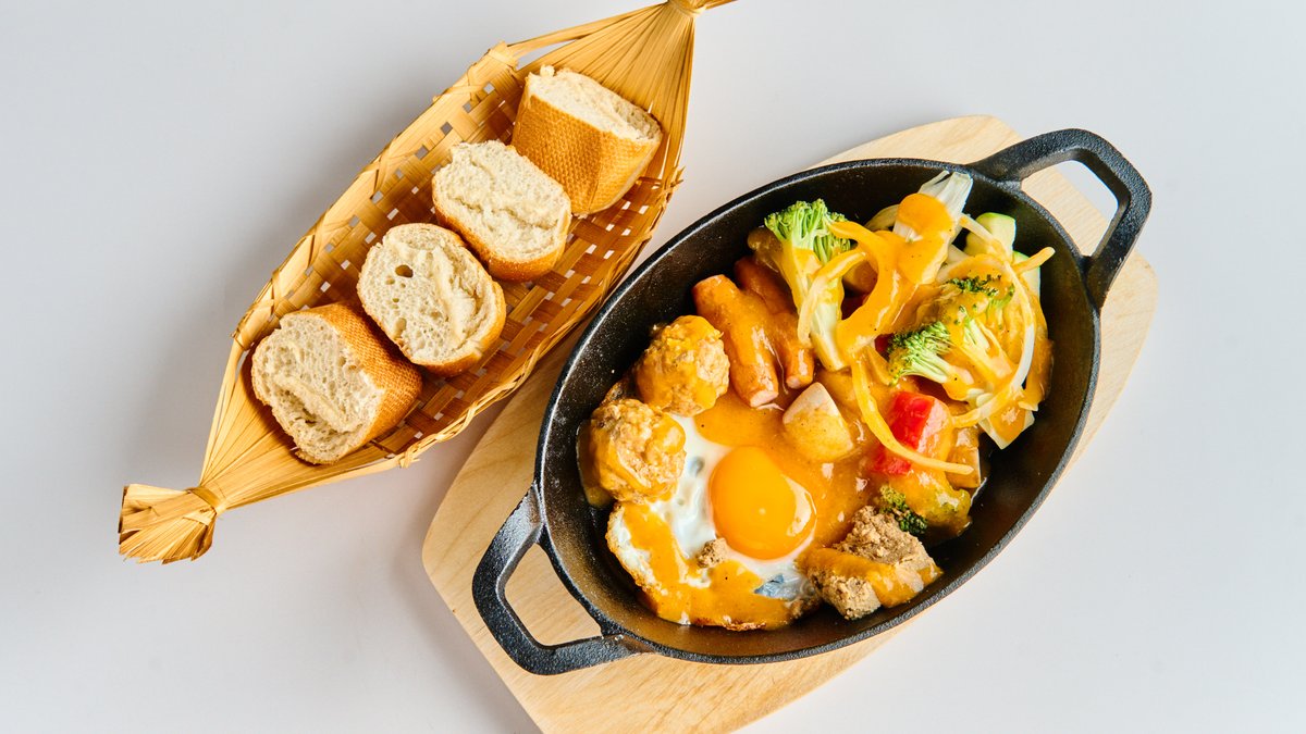vietnamesisches Pfannengericht mit knusprigem Brötchen zum Dippen, serviert mit hausgemachter Pastete, Würstchen, vietnamesische Art Fleischbällchen, Spiegelei, frischem Gemüse und Kräutern