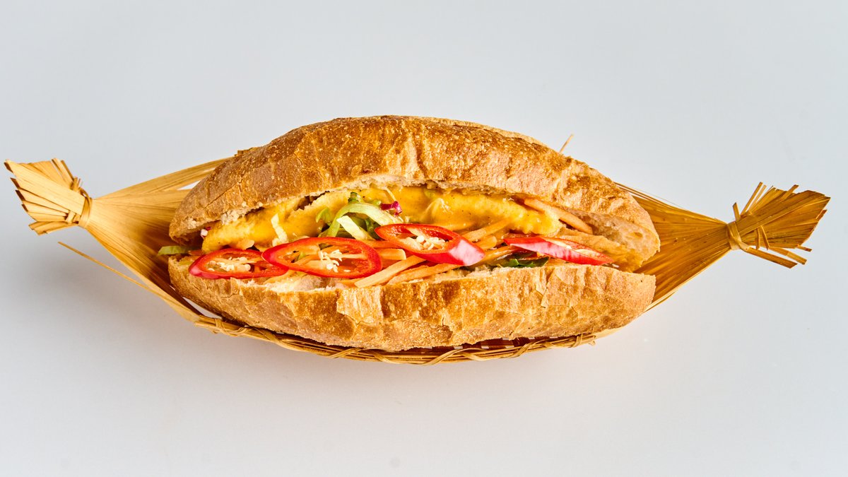 knuspriges vietnamesisches Baguette, gefüllt mit hausgemachter Pastete, Omelett, vietnamesischer Gió-Schweinewurst, frischem Gemüse, eingelegten Karotten, eingelegtem Rettich und Koriander