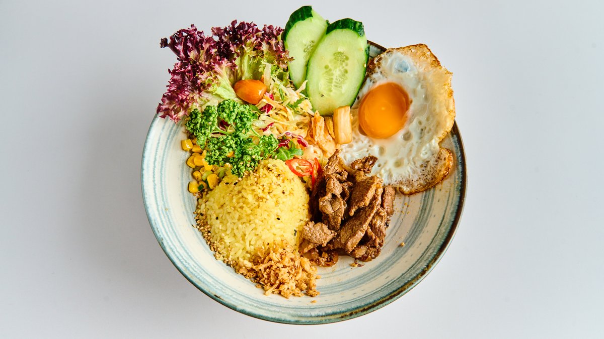 gelbe Reisschale mit gebratenem Rindfleisch, Kräutersalat, eingelegtem Gemüse, Mais Sauté und Spiegelei, dazu Teriyaki-Soße, Sesam und Röstzwiebeln