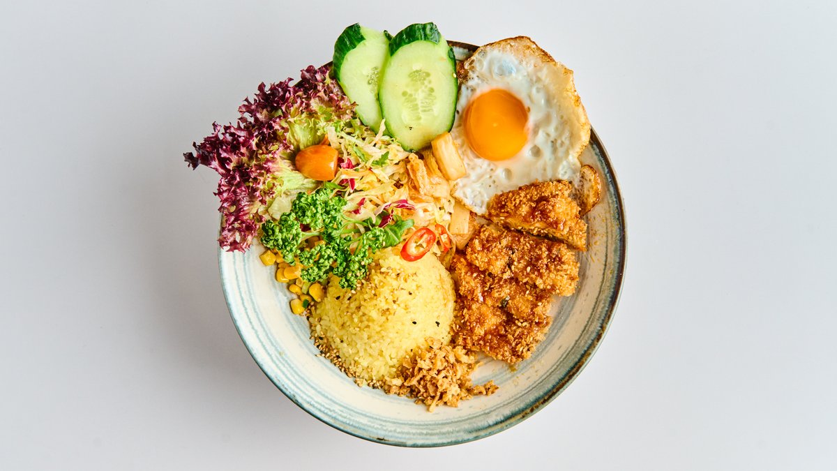 gelbe Reisschale mit Tempura-Hähnchenfilet, Kräutersalat, eingelegtem Gemüse, Mais Sauté und Spiegelei, dazu Teriyaki-Soße, Sesam und Röstzwiebeln