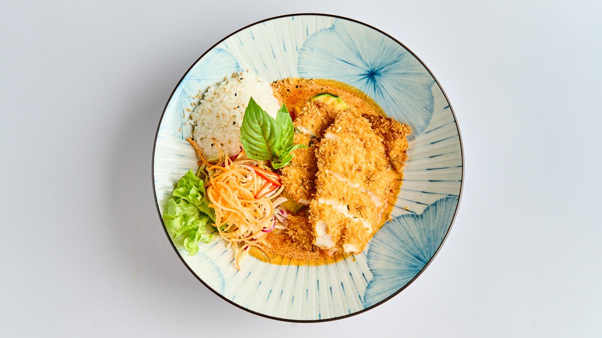 knuspriges Entenfilet oder knuspriges Tempura-Hähnchenfilet auf cremigem rotem Curryeintopf, dazu eingekochtes saisonales Gemüse, Süßkartoffeln, Kürbis und Kokosmilch, serviert mit Jasminreis und Thai-Basilikum