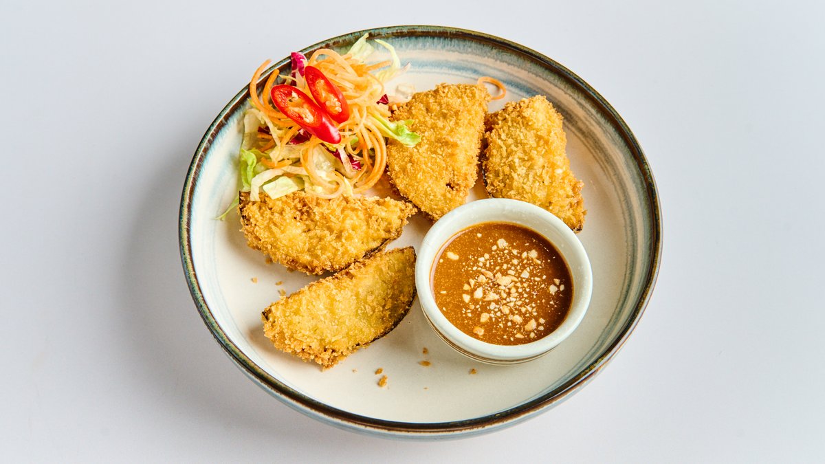 Tempura-Aubergine-Scheiben, dazu Erdnuss-Sojasoße
