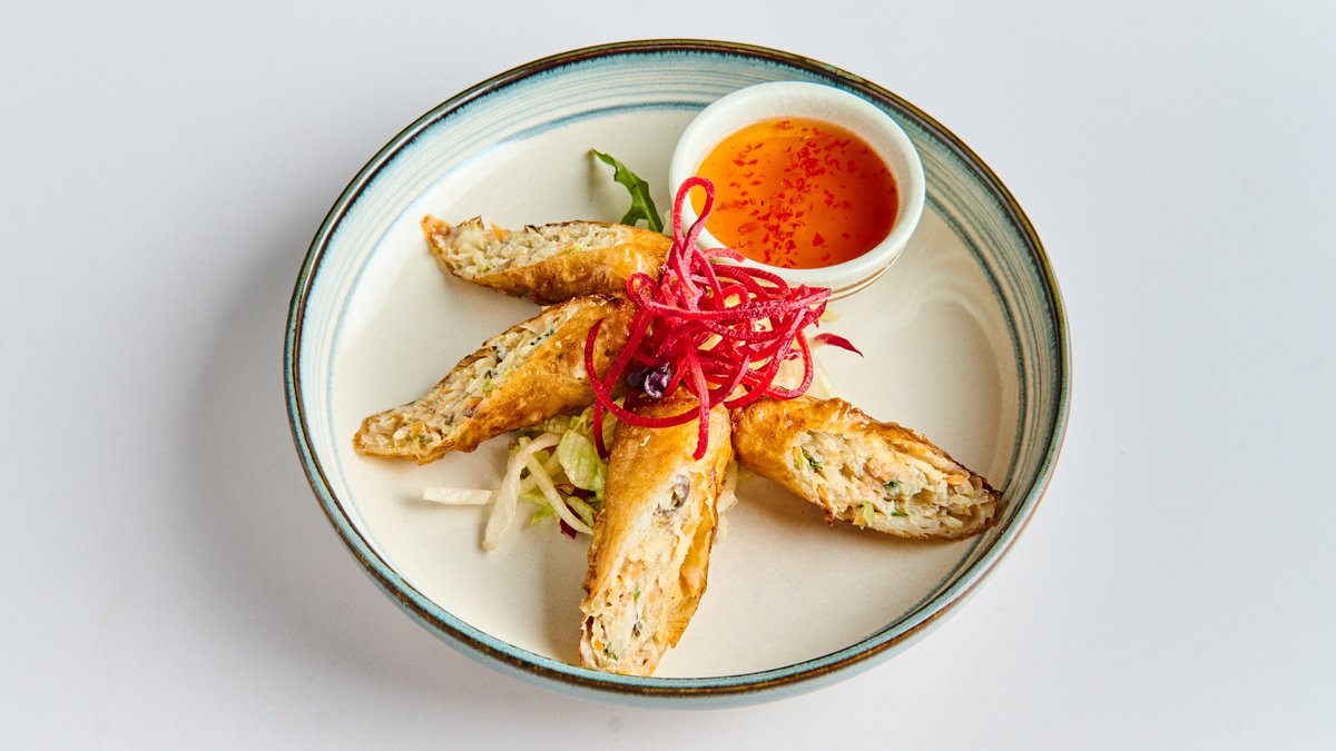 knusprige Frühlingsrollen auf gedämpften Reisnudeln und Gartensalat, dazu Ananas-Limetten-Fischsoße, vietnamesische Kräuter und geröstete Erdnüsse