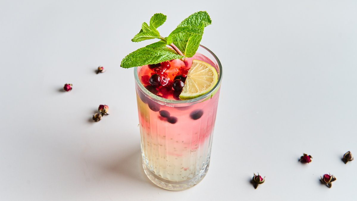 mit Aloe Vera Nektar, Lycheesaft, Chiasamen, Beerenmix und Limettensaft