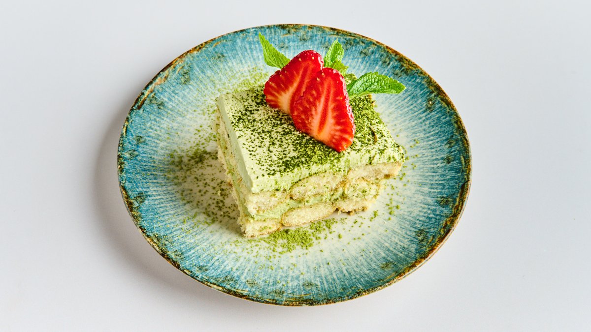 hausgemachtes Matcha-Tiramisu, dazu saisonales Obst