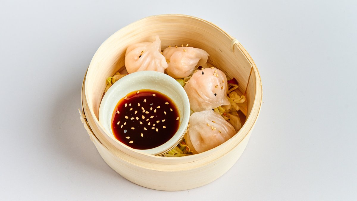 4 Stück gedämpfte Teigtaschen mit Füllung nach Wahl, serviert mit hausgemachtem süßem Soja-Dip