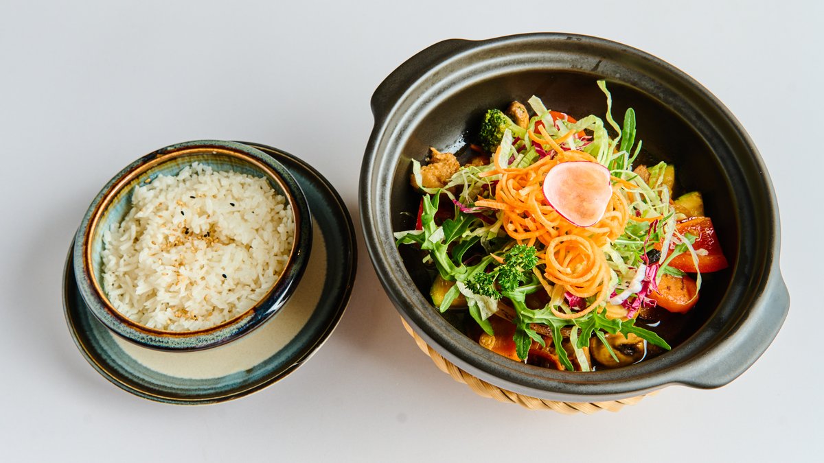 Seitanstreifen und Tofu im Tontopf mit geschmorten saisonalen Gemüsesorten, Champignons und Shiitake in Szechuan Pfeffer karamellisierter Sojabrühe, dazu Jasminreis als Beilage