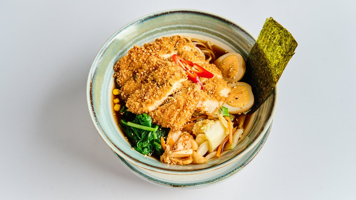 hausgemachte Ramen in einer klaren, tief aromatischen Shoyu-Brühe mit natürlichem Umami, frischem Gemüse, gekochtem Ei und einer Zutat nach Wahl, serviert mit eingelegtem Gemüse