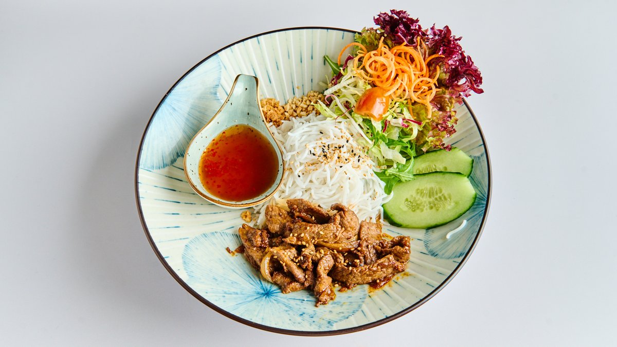 medium sautiertes Rinderfilet, Kräutersalat und Reisnudeln, verfeinert mit Ananas-Limetten-Fischsoße, vietnamesischen Kräutern und gerösteten Erdnüssen
