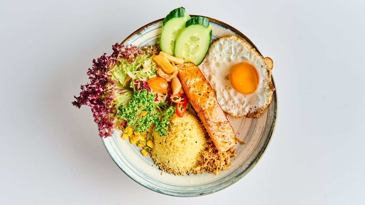 gelbe Reisschale mit gegrilltem Lachsfilet, Kräutersalat, eingelegtem Gemüse, Mais Sauté und Spiegelei, dazu Teriyaki-Soße, Sesam und Röstzwiebeln