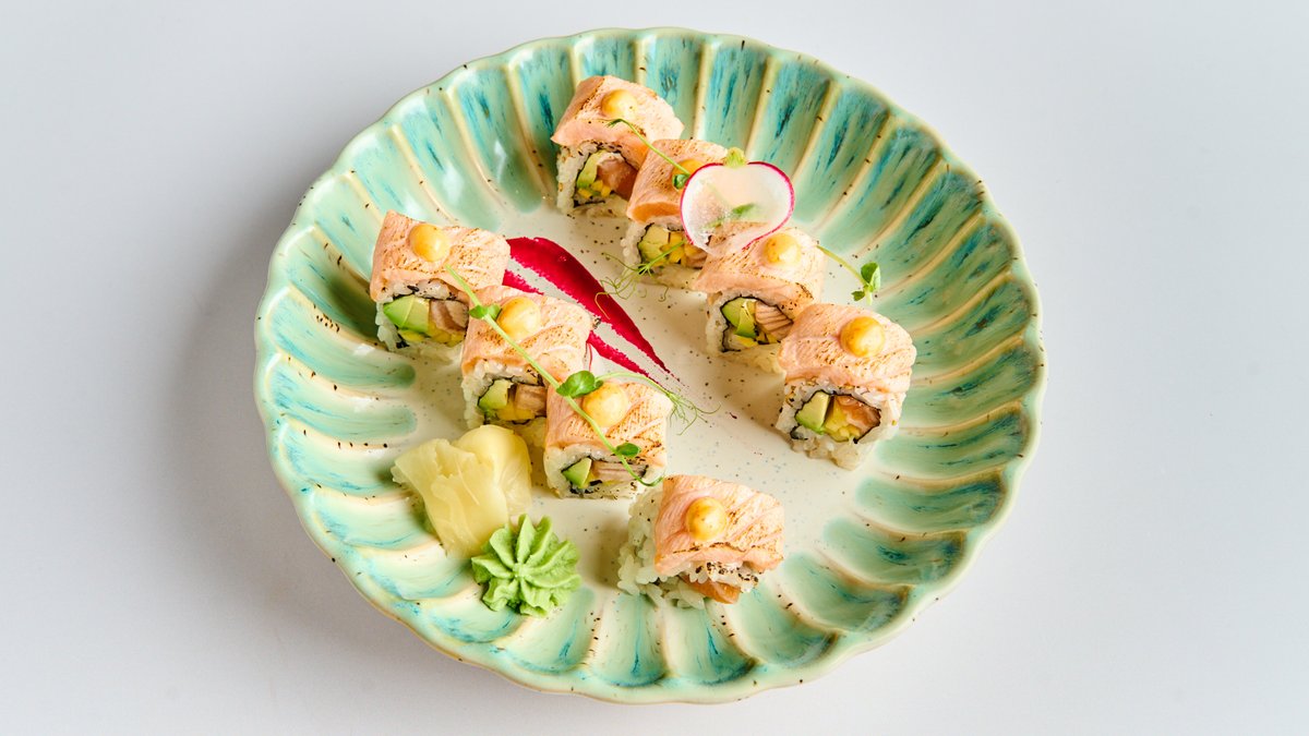 Spicy Tuna Tatar, Avocado, Mango, Sesam und Philly Cheese, umwickelt mit flambiertem Thunfisch