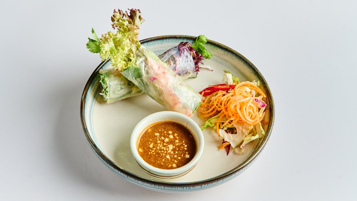 Reispapierrollen gefüllt mit Garnelen oder Seitan, Koriander, Reisnudeln, Gurke, Paprika und Salat, dazu Erdnuss-Soja-Dip