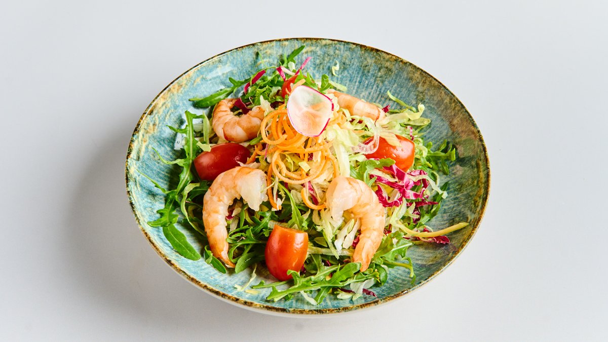 knackiger Sommersalat mit drei Tempura-Garnelen oder Tempura-Tofu, Avocado, Cherrytomaten und Wildkräutersalat, verfeinert mit hausgemachtem Sesam-Dressing
