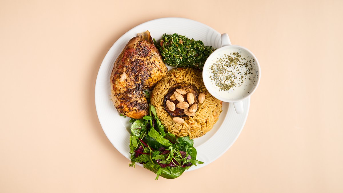 arabisches Schichtgericht mit Hähnchen, Reis, Kartoffeln, Möhren, Auberginen und Minzjoghurtsoße