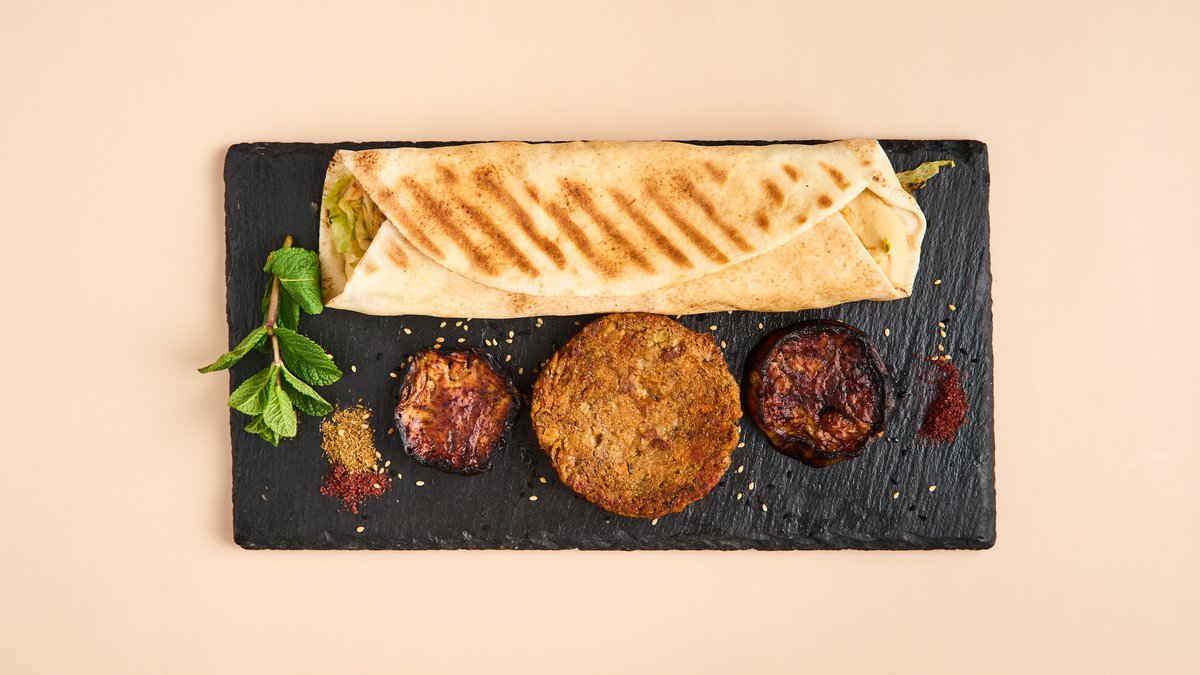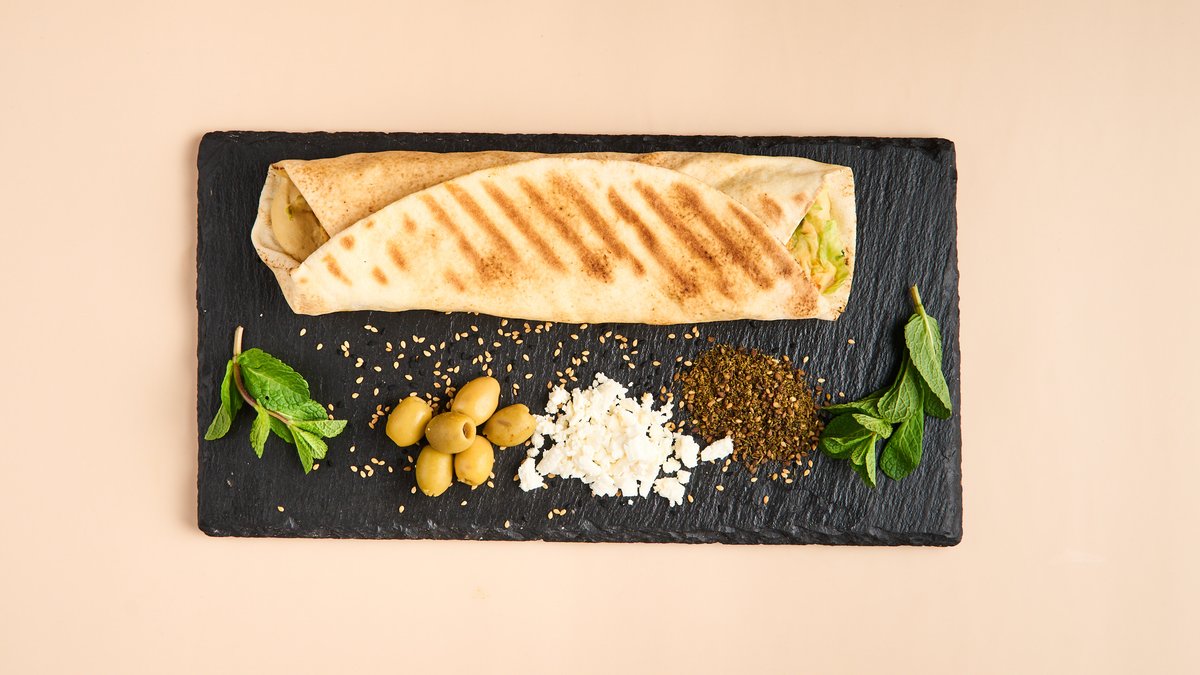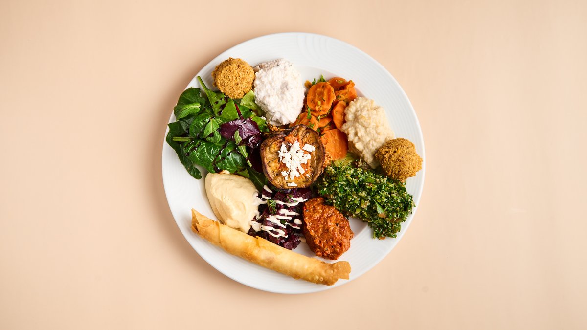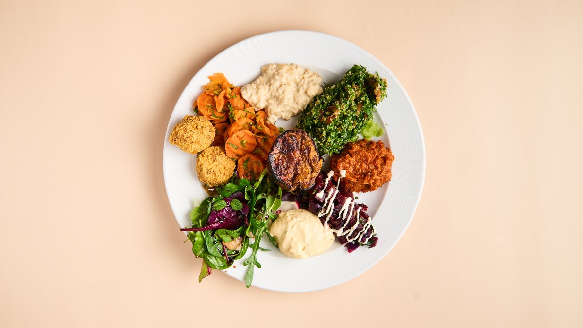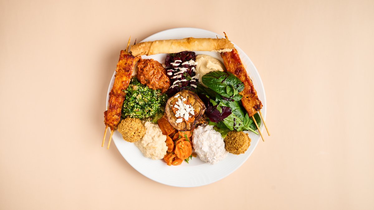 mit Schawerma, Falafel, Burek, Taboule, Fatousch, Möhren, Rote Beete, Aubergine, Hummus, Mohammara, Baba Ghanush, Labneh, Bulgursalat und Fladenbrot