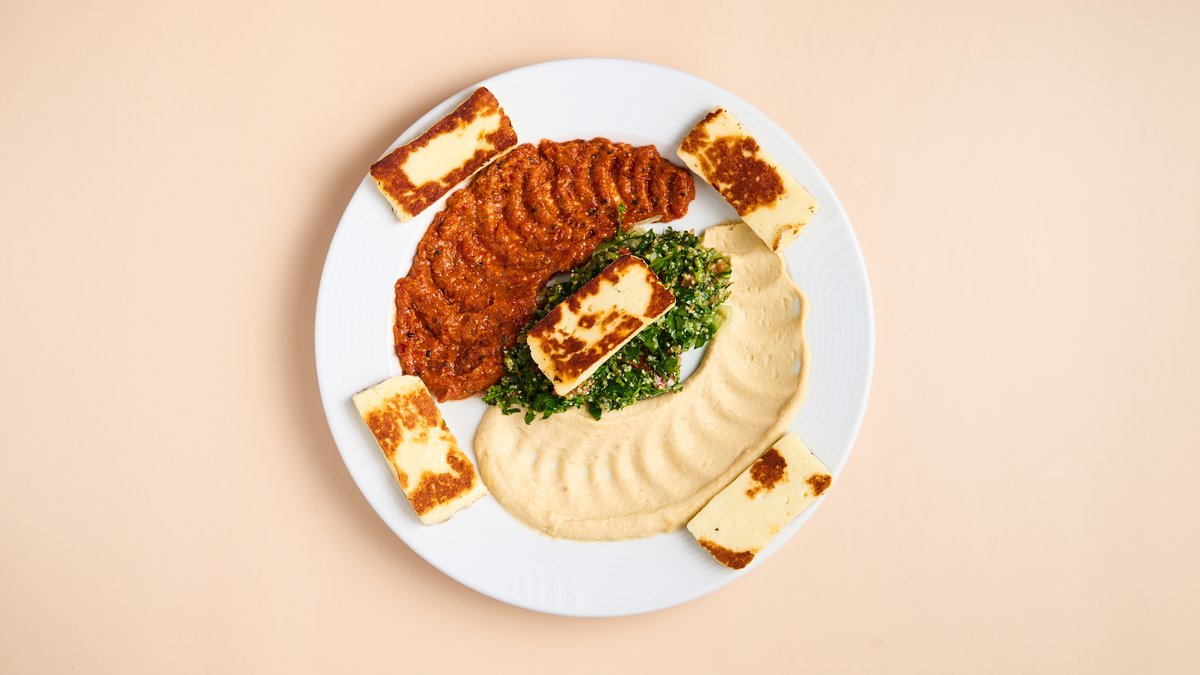 mit Grillkäse, Hummus, Mohammara und Salat