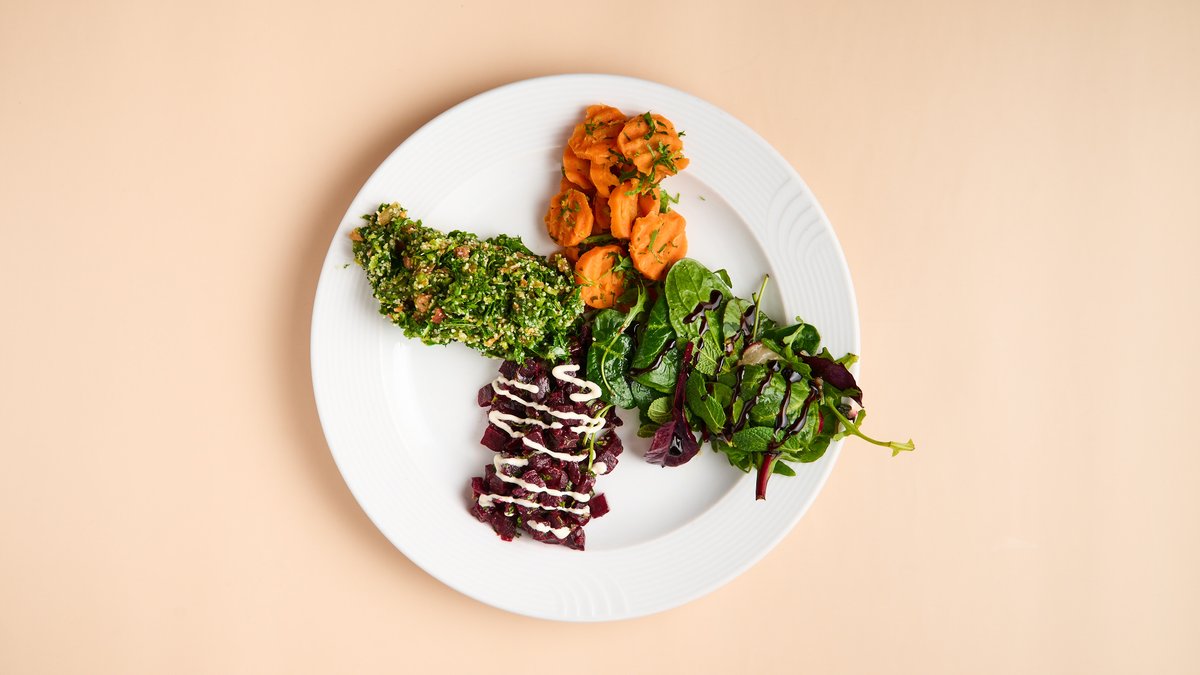 mit Taboule, Fatousch, Möhren, Rote Beete und Tahinidressing