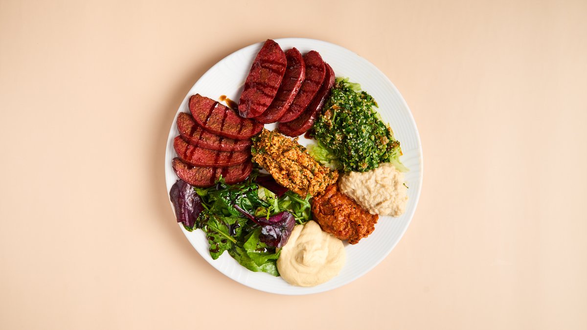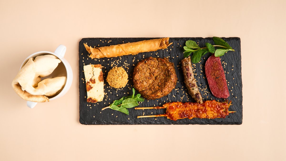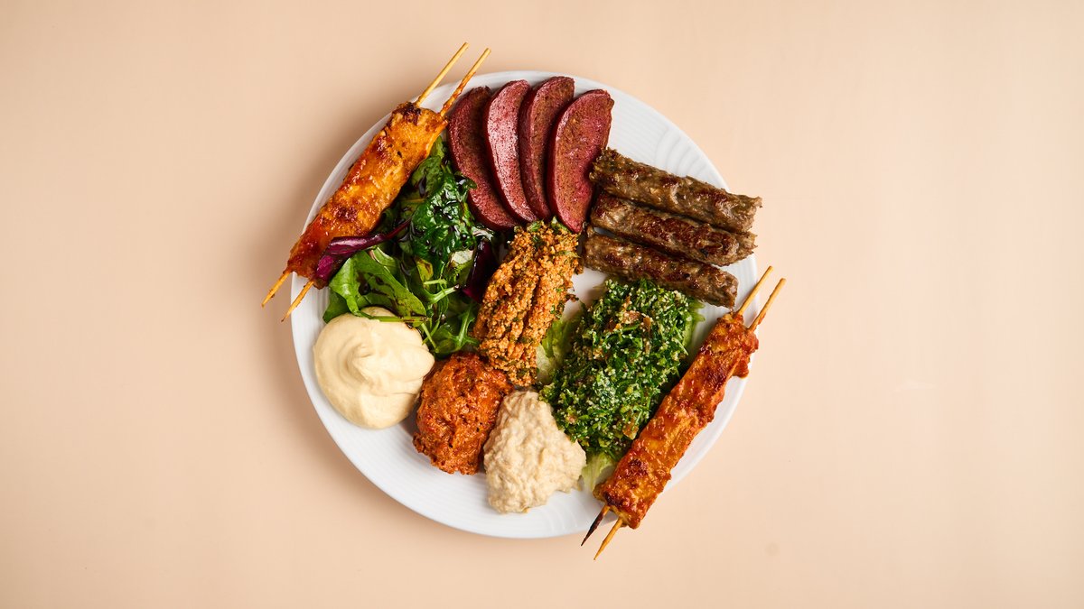 mit Schawerma, Kufte, Sujuk, Taboule, Fatousch, Hummus, Mohammara, Baba Ghanush, Bulgursalat und Fladenbrot