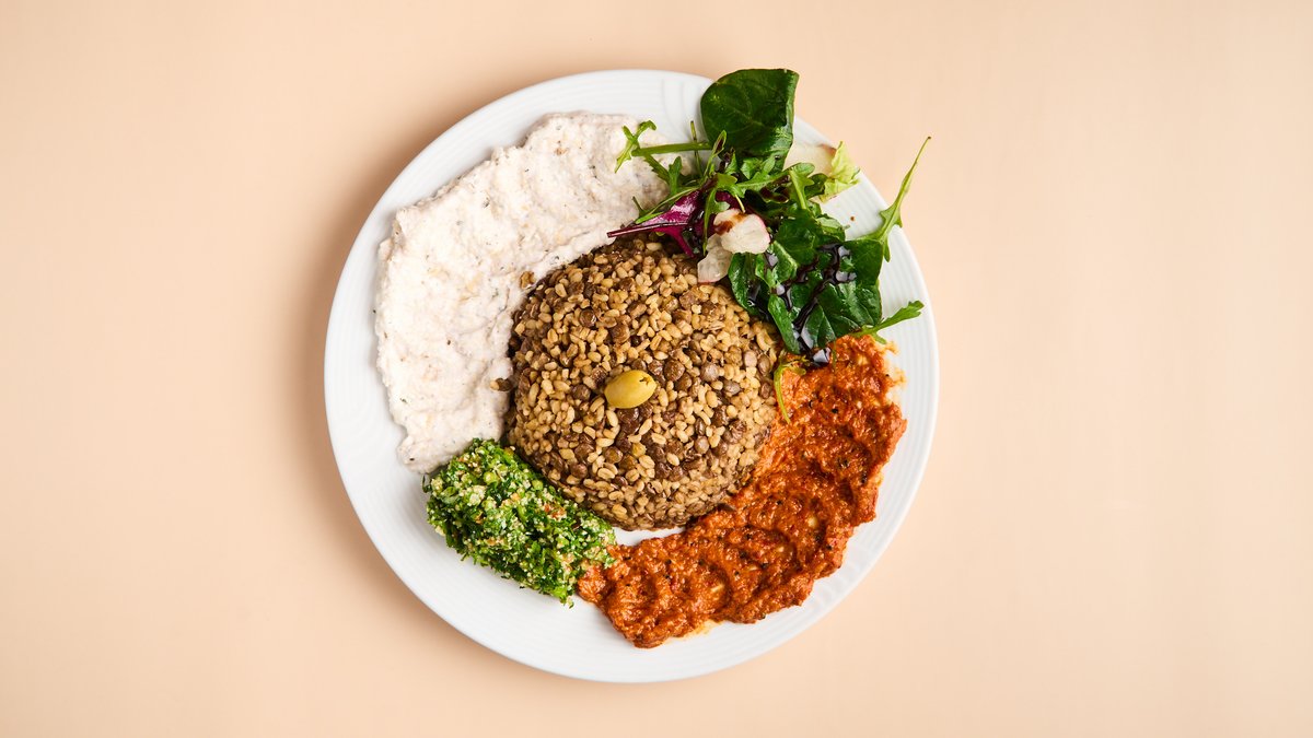 Syrische Spezialität aus Bulgur, gefüllt mit Hackfleisch, Walnüssen und Granatapfel . 3 Stück mit Tabouleh, Baba Ghanush, Hummus Mohammara und einer gelben linsensuppe
